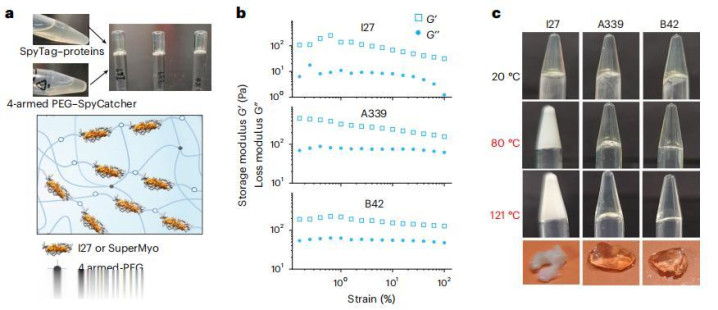 同期,把它的搭档 SpyCatcher 联贯到一种四臂的聚乙二醇分子上。当两者混杂之后,SpyTag 和 SpyCatcher 就会飞速扣合,将卵白质和聚乙二醇交联在一都,倏地即可造成透明的水凝胶。