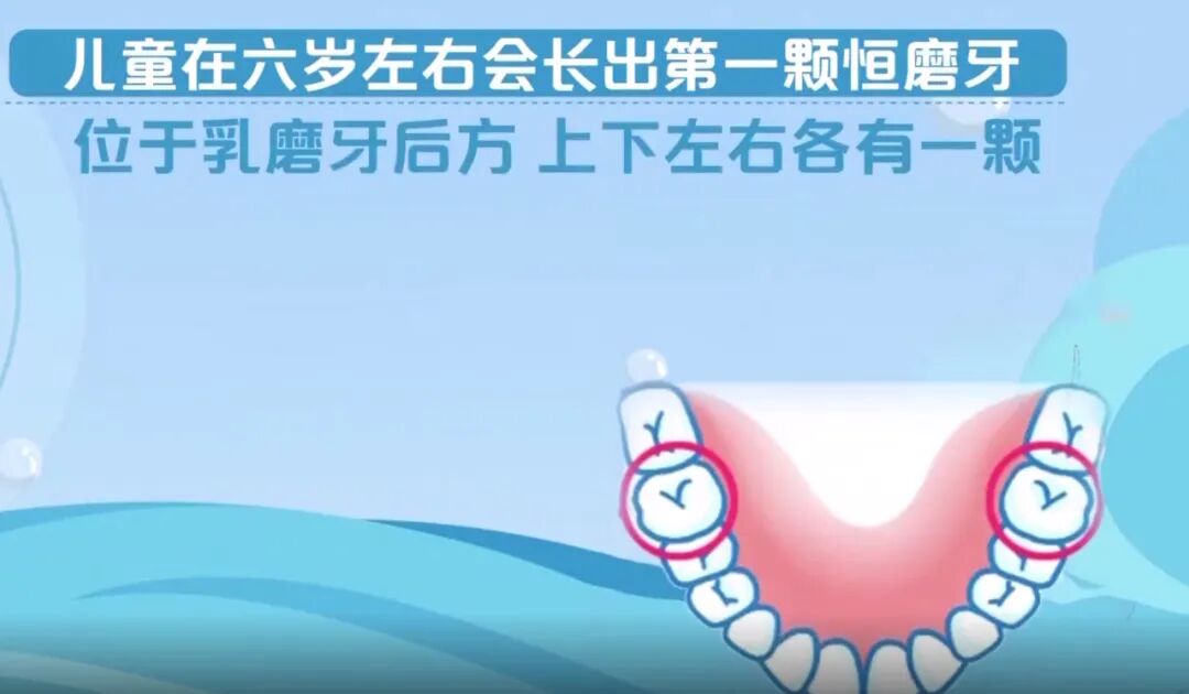 儿童在六岁傍边会长出第一颗恒磨牙,位于乳磨牙后方,凹凸傍边各有一颗,称为“六龄齿”。